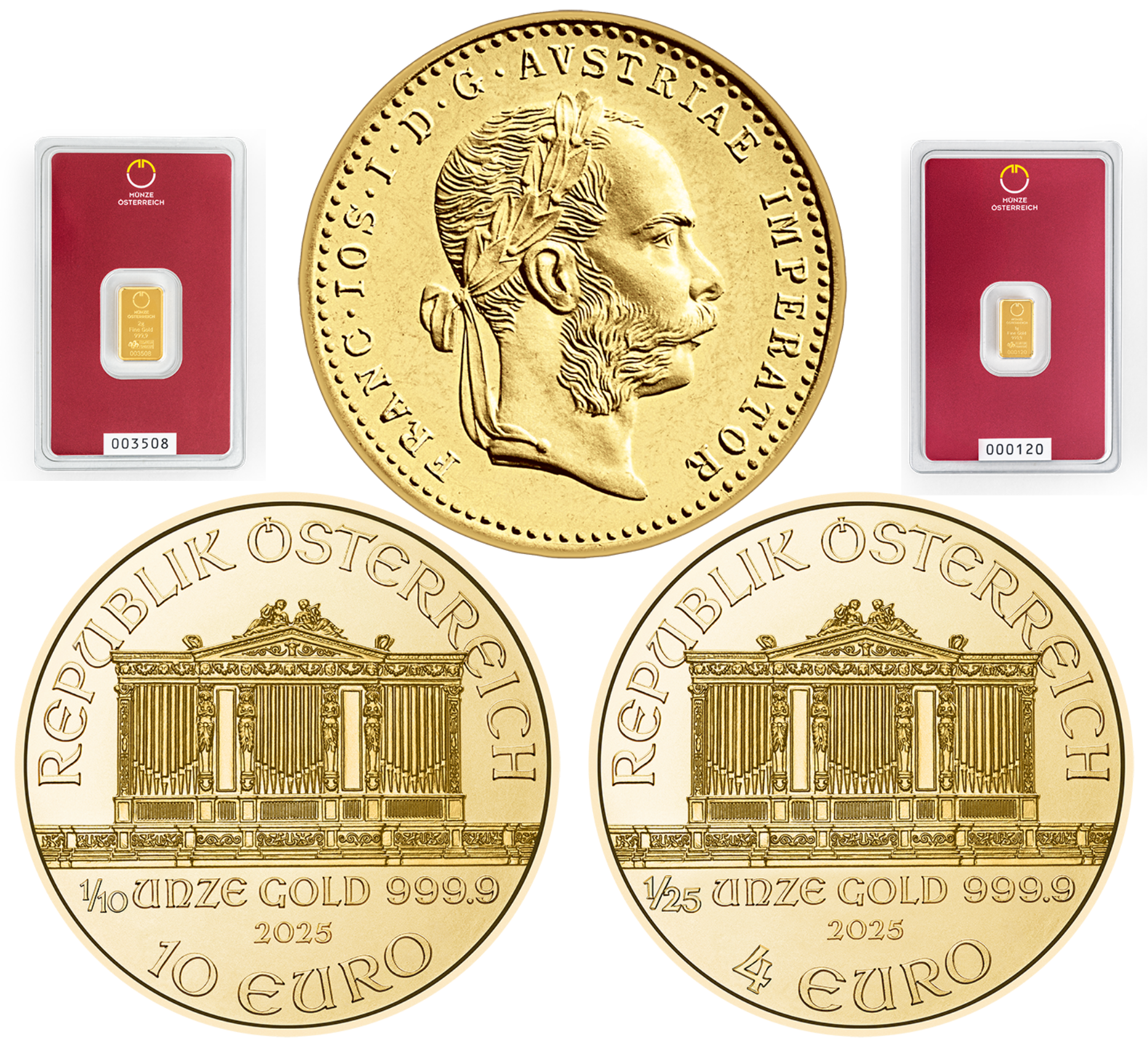 1× Einfachdukaten (1 Dukat), 1× Wiener Philharmoniker 1/10 oz, 2× Wiener Philharmoniker 1/25 oz, 1× 1 g Goldbarren (Münze Österreich), 1× 2 g Goldbarren (Münze Österreich).