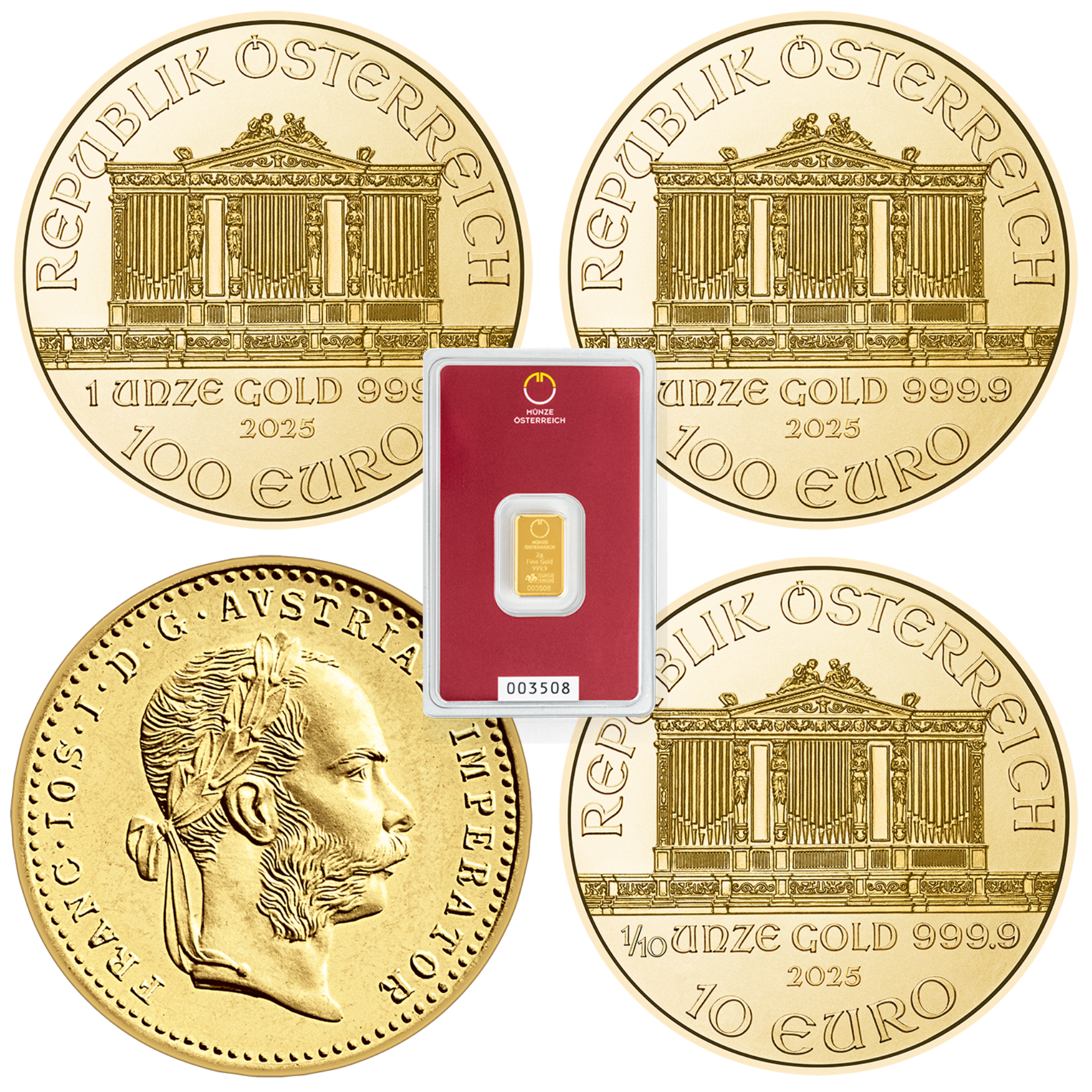 Zuhause: 1× Einfachdukaten, 1× Wiener Philharmoniker 1/10 oz, 1× Goldbarren 2 g (Münze Österreich).